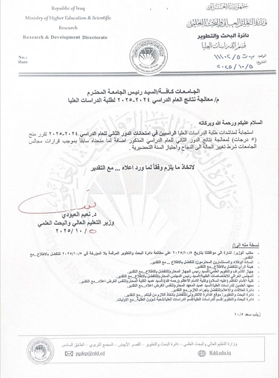استجابة لمناشدات طلبة الدراسات العليا الراسبين في امتحانات الدور الثاني للعام الدراسي ٢٠٢٤-٢٠٢٥ تقرر منح (٥ درجات) لمعالجة نتائج الدور الثاني للعام الدراسي المذكور اضافة لما منحناه سابقاً بموجب قرارات مجالس الجامعات شرط تغيير الحالة الى النجاح واجتياز السنة التحضيرية .
