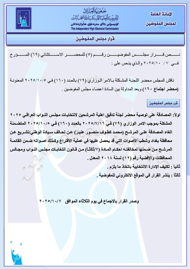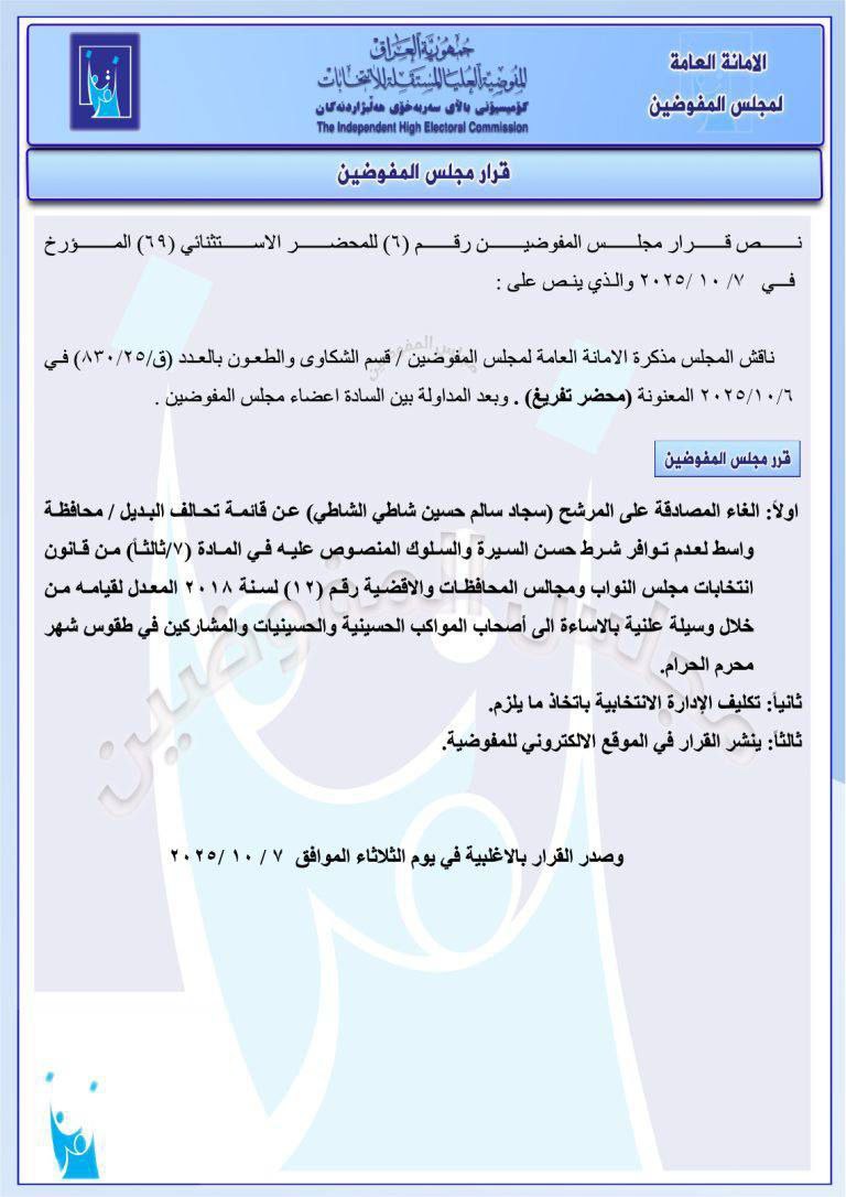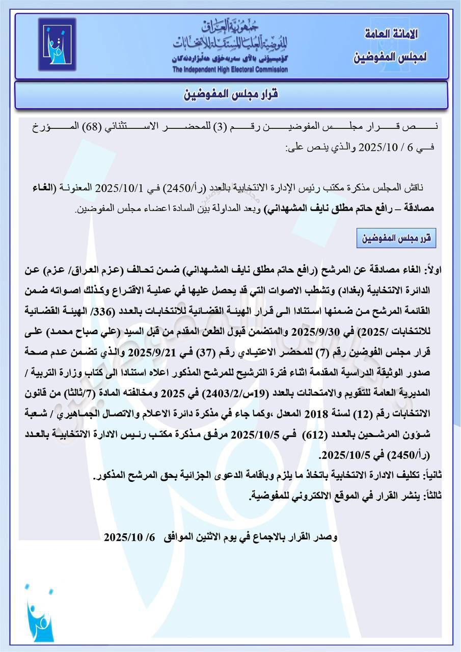 اولاً: الغاء مصادقة عن المرشح (رافع حاتم مطلق نايف المشهداني) ضمن تحالف (عزم العراق/ عزم) عن الدائرة الانتخابية (بغداد) وتشطب الاصوات التي قد يحصل عليها في عملية الاقتراع وكذلك اصواته ضمن القائمة المرشح من ضمنها استنادا الى قرار الهيئة القضائية للانتخابات بالعدد (336/ الهيئة القضائية للانتخابات /2025) في 2025/9/30 والمتضمن قبول الطعن المقدم من قبل السيد (علي صباح محمد) على قرار مجلس الفوضين رقم (7) للمحضر الاعتيادي رقم (37) في 2025/9/21 والذي تضمن عدم صحة صدور الوثيقة الدراسية المقدمة اثناء فترة الترشيح للمرشح المذكور اعلاه استنادا الى كتاب وزارة التربية /