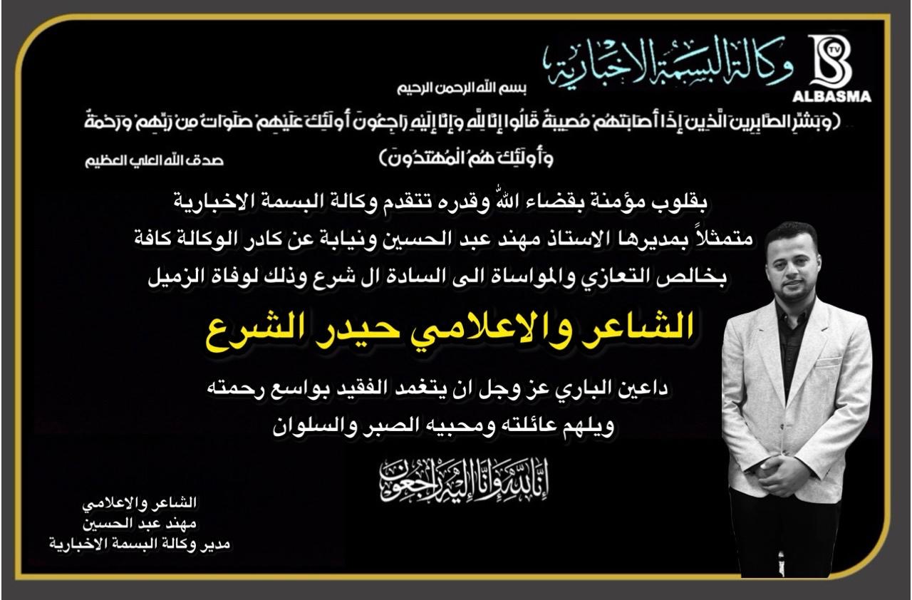 بقلوب مؤمنة بقضاء اللّٰهُ وقدره تتقدم وكالة البسمة الاخبارية متمثلاً بمديرها الاستاذ مهند عبد الحسين ونيابة عن كادر الوكالة كافة بخالص التعازي والمواساة الى السادة ال شرع وذلك لوفاة الزميل الشاعر والاعلامي حيدر الشرع