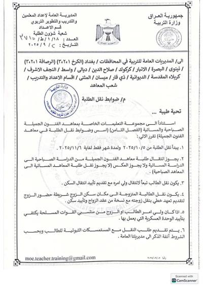 ▪️وزارة التربية تفتح أبواب النقل أمام طلبة معاهد الفنون الجميلة لغاية السادس من تشرين الثاني